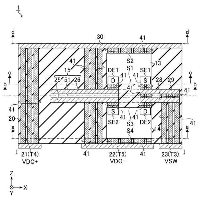 前記第1スイッチング素子の裏面は、少なくとも1つの第1ビアを介して前記第6配線層に接続され、