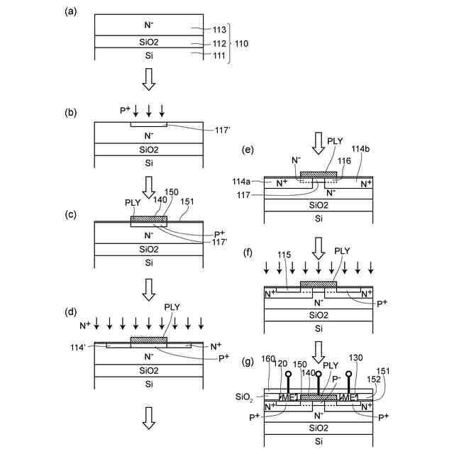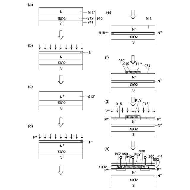 従来の他の半導体装置900は、例えば、以下のような方法で製造することができる。すなわち、従来の他の半導体装置900の製造方法は、半導体支持基板911、半導体支持基板911上に配置された絶縁層912、及び、絶縁層912上に配置されたN型層913’’を有するSOI基板910を準備する工程と(図7(a)参照)、N型層913’’の表面にN型不純物を導入する工程と(図7(b)参照)、N型不純物を熱拡散させて高濃度のN