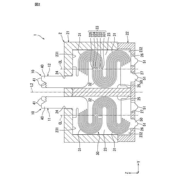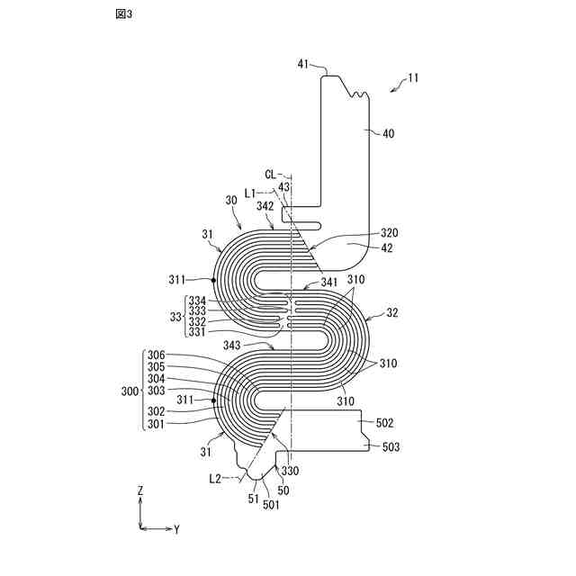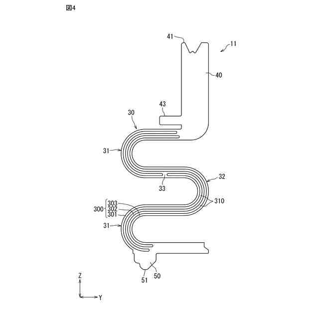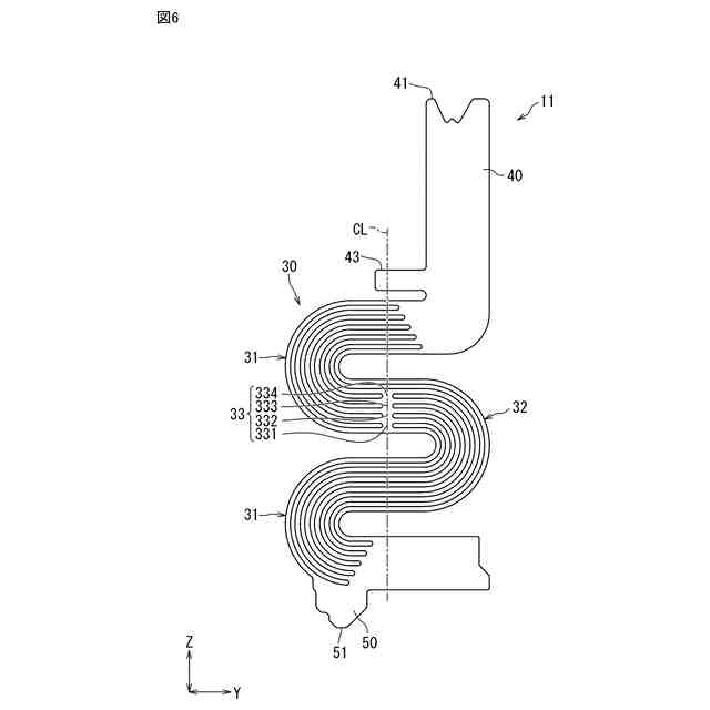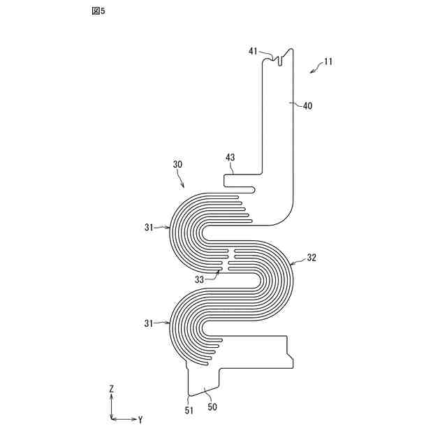 複数の前記第1湾曲部のうち、前記第1方向の一端に位置する前記第1湾曲部が前記第1接点部に接続され、