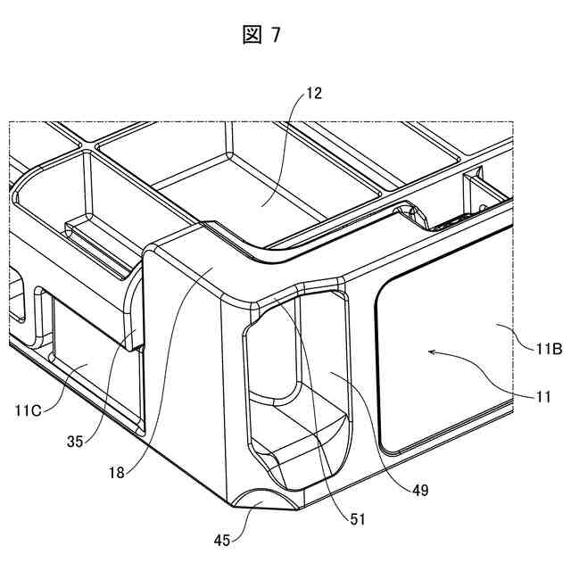 前記第1容器は、組立状態において、前記第2受容部の上方に配置される前記回動側壁部の両側辺部の下端には、上方へ窪む凹部が形成され、前記第2受容部の上端と前記凹部の内周面との間には空間が形成される、
