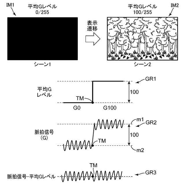 例えば、ユーザを撮影して取得した画像のG成分の輝度値(以下、G成分値と呼ぶ)に基づいて脈波を検出する場合を想定する。ここで、森林などが映し出されている動画コンテンツがディスプレイに投影されると、ディスプレイからの表示光によってユーザの皮膚は緑色に照らされる。このタイミングで画像の撮影が行われると、画像には緑色に照らされた皮膚が写り込む。そして、この画像からG成分値を抽出した場合、過大なG成分値が抽出され、これにより不正確な脈波が取得される可能性がある。