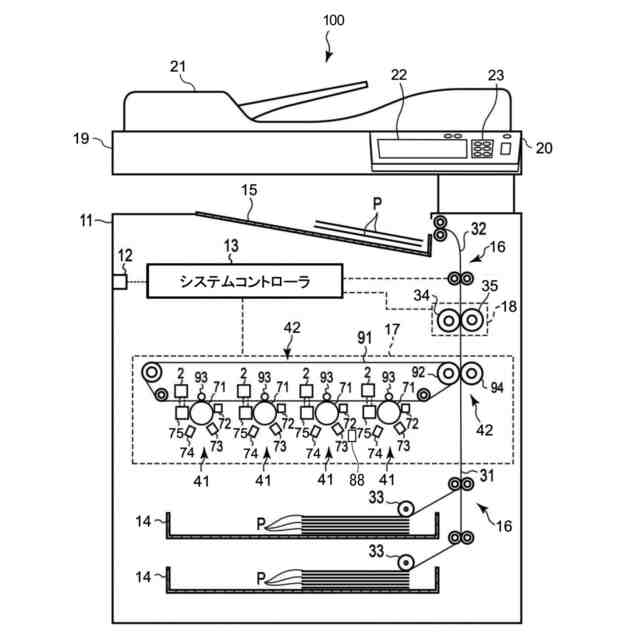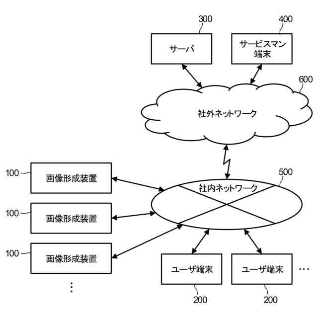 図1は、第1実施形態に係る画像形成装置を複数台含む印刷システムの概略構成図である。印刷システムは、更に、複数のユーザ端末200と、サーバ300と、サービスマン端末400と、を備えている。各画像形成装置100は、ワークプレイスに置かれ、例えば同じワークプレイスに配置されたユーザ端末200に、LAN(Local Area Network)等の社内ネットワーク500を介して通信可能に接続され得る。この接続は、有線接続であっても良いし、無線接続であっても良い。また、社内ネットワーク500は、インターネット等の社外ネットワーク600と接続される。サーバ300及びサービスマン端末400は、社外ネットワーク600と接続される。これにより、画像形成装置100は、社内ネットワーク500及び社外ネットワーク600を介してサーバ300と通信可能に接続され得る。