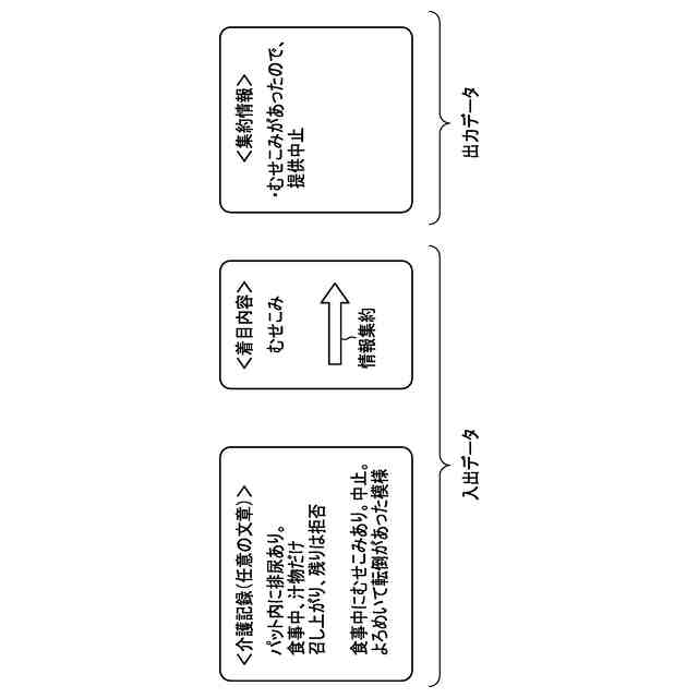 特許文献1に記載されたシステムは、商品レビュー文などの要約タスクに関するものである。当該システムは、例えば、入力文をカテゴリ分けする過程、重複する内容などをクラスタリングする過程を通じて要約する。