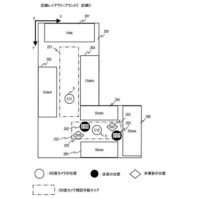 前記カメラそれぞれの位置と、前記店員それぞれの位置と、を示す位置管理情報を保持し、