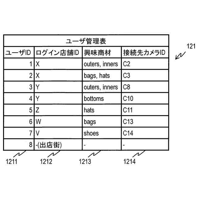前記メモリは、複数の店舗それぞれに配置され、ユーザ端末に接続可能であるカメラそれぞれの撮影可能エリアに含まれる店員の人数及び来場客の人数、並びに前記カメラそれぞれに接続中のユーザ端末を示すカメラ管理情報を保持し、
