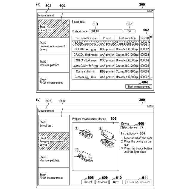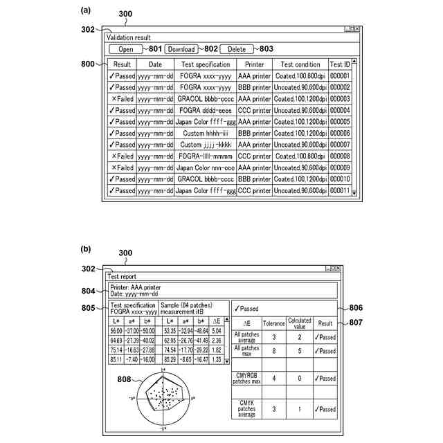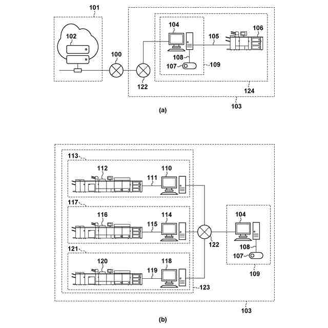 図1(b)は、本実施形態における色検証システム構成の一例を示す図である。図1(a)については後述する。商業印刷においては、ロール紙への印刷や、A1サイズ用紙への印刷を行うような大型の画像形成装置も存在する。図1(b)はそのような構成の一例を示し、画像形成装置と、画像形成装置の管理と制御を行うデジタルフロントエンドとを含む構成例である。図1(b)の構成では、例えばシステム113と、クライアント装置104とは物理的に離れた場所にあり、色検証アプリケーションは、システム113のデジタルフロントエンド110にて実行される。そして、図1(b)に示すような、画像形成装置およびデジタルフロントエンドのサーバを複数台運用するようなユーザ環境では、ウェブサーバが複数存在し、それぞれが独立した環境であり、並行しての利用が想定される。