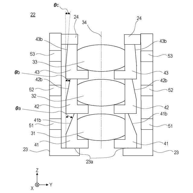 【解決手段】 第1光学素子を保持する第1保持部と、前記第1保持部に重ねられた、第2光学素子を保持する第2保持部と、前記第1保持部と前記第2保持部とを収納し、前記第1保持部を支持する支持面を含む鏡筒と、を備え、前記第1保持部は、前記鏡筒と対向する位置に、前記第1光学素子の光軸に対して傾いている第1斜面を有し、前記第2保持部は、前記鏡筒と対向する位置に、前記第2光学素子の光軸に対して傾いている第2斜面を有し、前記鏡筒には、前記第1斜面と対応する位置にあり、前記第1光学素子の光軸に直交する第1方向に沿った第1貫通孔と、前記第2斜面と対応する位置にあり、前記第2光学素子の光軸に直交する第2方向に沿った第2貫通孔と、が設けられている。