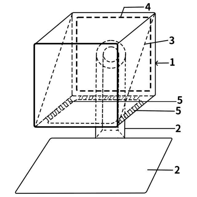 光学の原理図 参照符号リスト1筐体 2支持具 3半透明半反射鏡 4反射鏡 5光源 6物体 7前面 8下部
