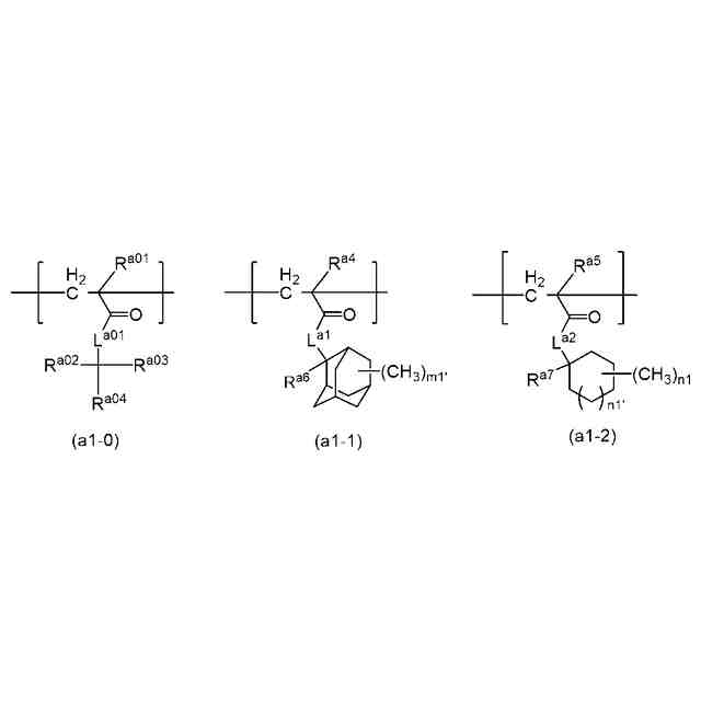 -で置き換わる場合、各基において同様の例を適用するものとし、置き換わる前の炭素数を炭化水素基等の炭素数とする。「組み合わせた基」とは、例示した基を2種以上結合させた基を意味し、それら基の価数は結合形態によって適宜変更してもよい。「由来する」又は「誘導される」とは、その分子中に含まれる重合性C=C結合が重合により-C-C-基(単結合)となることを指す。立体異性体が存在する場合は、全ての立体異性体を含む。各基は、置換基の数等によって、その基に含まれる任意の位置及び数の水素原子が結合部位に置き換わることがある。置換基における炭素数は、被置換基の炭素数には含めない。「酸不安定基」とは、酸(例えば、トリフルオロメタンスルホン酸等)と接触すると、脱離基が脱離して、親水性基(例えば、ヒドロキシ基又はカルボキシ基等)を形成する基を意味する。「塩基不安定基」とは、塩基(例えば、トリメチルアミン、テトラメチルアンモニウムヒドロキシド等)と接触すると、脱離基が脱離して、親水性基(例えば、カルボキシ基又はヒドロキシ基等)を形成する基を意味する。
