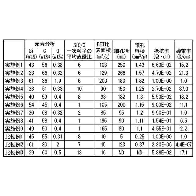 又はAr)であることが記載されているが、導電性についての言及は無い。また、特許文献3では、アルコキシシラン、炭素含有化合物、界面活性剤を混合してセラミック前駆体を合成し、不活性雰囲気下にて焼成することで多孔質シリコンカーバイド複合材料を得るが、この製法では、特許文献2と同様、細孔径及び比表面積の異なる種々の多孔質シリコンカーバイド複合材料を製造することができない。