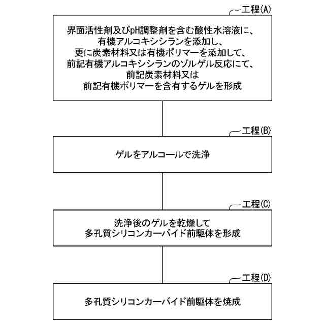 また、特許文献3には、炭素前駆体、シリカ前駆体、界面活性剤、および油を含む前駆体混合物を形成し、前記前駆体混合物を乾燥し、前記炭素前駆体およびシリカ前駆体を架橋して、界面活性剤系の自己組織化テンプレートと、前記テンプレートによって規則化された、炭素前駆体およびシリカ前駆体系のメソ構造相とを形成し、前記前駆体を熱処理して、規則性メソ多孔質炭化ケイ素ナノ複合材料を形成する、規則性メソ多孔質炭化ケイ素ナノ複合材料の製造方法が開示されている。