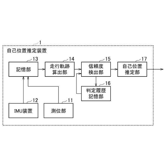 図1を参照して、第1実施形態を含む複数の実施形態に係る自己位置推定装置1の構成を説明する。自己位置推定装置1は、測位部11と、走行軌跡算出部14と、信頼度検出部15と、判定履歴記憶部16(信頼度記憶部の一例)と、自己位置推定部17と、を有する。実施形態では、移動体として車両を例示して説明するが、車両以外の船、飛行機、ロケットなど、車輪を有していない移動体にも適用可能である。