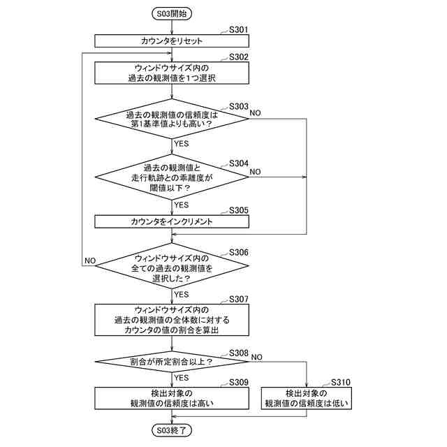 前記走行軌跡に対応する区間における前記過去の観測値の全体数に対して、前記乖離度が前記閾値以下と判定された前記過去の観測値の数が占める割合が大きい程、前記検出対象の観測値の信頼度を高く検出する