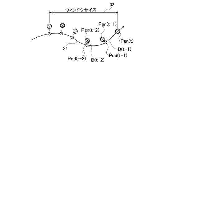 図7は、検出対象の観測値としての車両の位置(Pgn(t))と、走行軌跡31に対応する区間(ウィンドウサイズ)32における過去の観測値の一例としての車両の位置(Pgn(t)、Pgn(t-1)、Pgn(t-2)、・・・)と、乖離度の一例としての距離(D(t-1)、D(t-2)、・・・)を示す概念図である。