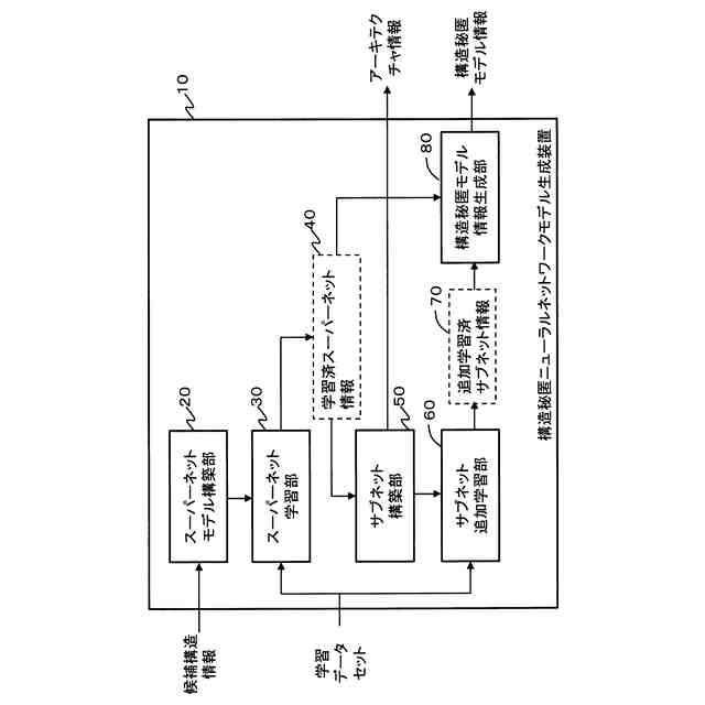 【解決手段】サブネット構築手段は、学習済スーパーネット情報内のアーキテクチャパラメータに基づいて、ブロック毎に1つの候補構造を特定する情報であるアーキテクチャ情報と、アーキテクチャ情報によって定まるサブネット情報とを生成する。サブネット追加学習手段は、学習データセットを用いた学習で、サブネット情報内のパラメタを更新することによって、追加学習済サブネット情報を生成する。構造秘匿モデル情報生成手段は、学習済スーパーネット情報に含まれている所定モジュールおよびアーキテクチャパラメタを除外した上で、学習済スーパーネット情報に含まれているパラメタのうち、サブネット情報に該当する部分のパラメタを、追加学習済サブネット情報に含まれるパラメタで置換することによって、構造秘匿モデル情報を生成する。