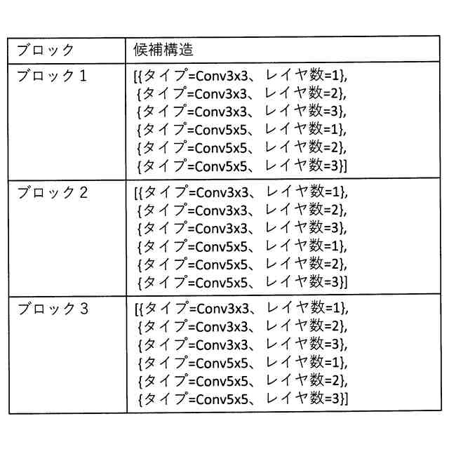 前記学習済スーパーネット情報内の前記アーキテクチャパラメータに基づいて、ブロック毎に1つの候補構造を特定する情報であるアーキテクチャ情報と、前記アーキテクチャ情報によって定まるサブネット情報とを生成し、前記アーキテクチャ情報を出力するサブネット構築手段と、