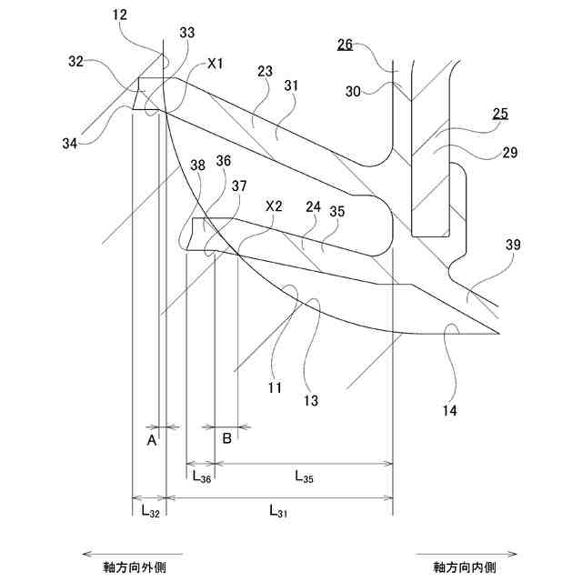 前記第1屈曲点は、軸方向に関して前記平面部又は前記傾斜部を超えた位置に位置し、かつ、前記第2屈曲点は、軸方向に関して前記傾斜部を超えた位置に位置し、