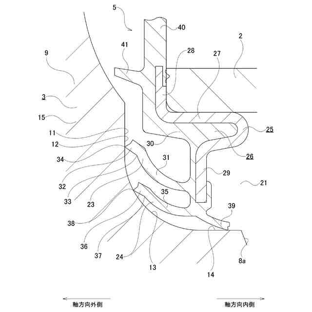 シール摺接面108は、ハブ102の中心軸に直交する円輪状の平面により構成された平面部109と、軸方向に関して環状空間103から離れるほど径方向外側に向かう方向に曲線的に傾いた傾斜面により構成された傾斜部110と、円筒面部111とを有する。
