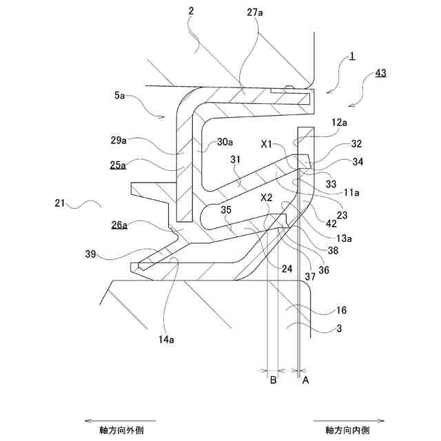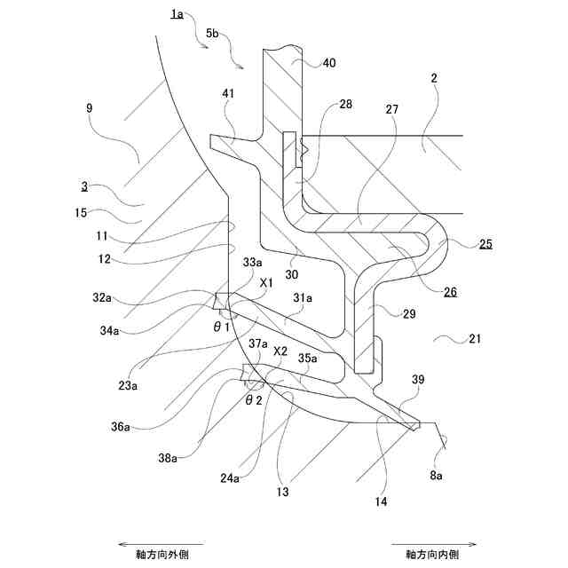 【解決手段】シールリング5は、ハブ3の中心軸Oを含む仮想平面で切断した断面において、第1サイドリップ23及び第2サイドリップ24を自由状態で表した場合、第1屈曲点33が、軸方向に関して傾斜部13を超えた位置に位置し、かつ、第2屈曲点37は、軸方向に関して傾斜部13を超えた位置に位置しており、第1屈曲点33から、傾斜部13と第1主部31の内周面との交点X1までの第1軸方向距離Aが、第2屈曲点37から、傾斜部13と第2主部35の内周面との交点X2までの第2軸方向距離Bよりも短くなっている。