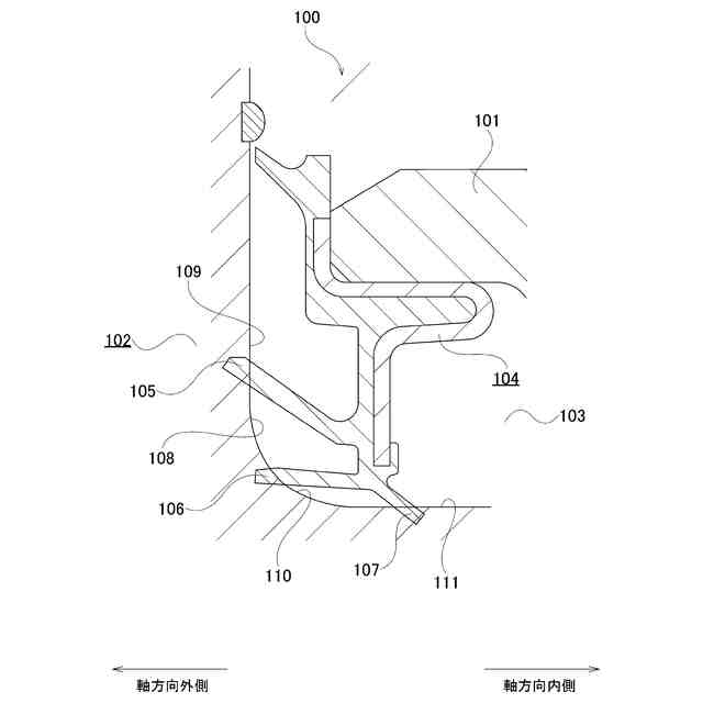 ハブ102は、第1サイドリップ105、第2サイドリップ106及びグリースリップ107のそれぞれの先端部を摺接させる、シール摺接面108を有する。