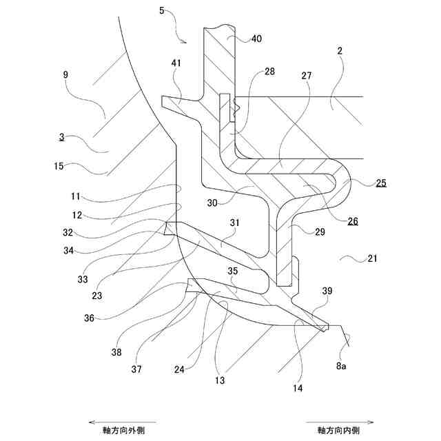 第2サイドリップ106は、主として、第2サイドリップ106と第1サイドリップ105との間の空間に封入されたグリースと、第2サイドリップ106とグリースリップ107との間の空間に封入されたグリースとの移動を防止する役割を担っており、その先端部を傾斜部110に摺接させる。