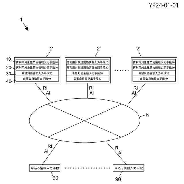 (3)上記再利用対象建築物情報公開手段(20)で上記ネットワーク(N)上に公開された再利用対象建築物情報(RI)に基づき当該再利用対象建築物の利用を希望するユーザーとしての会員が、会員としての利用を申し込む旨の申込み情報(AI)を入力することができる、上記ネットワーク(N)に接続可能な、複数の申込み情報入力手段(90)