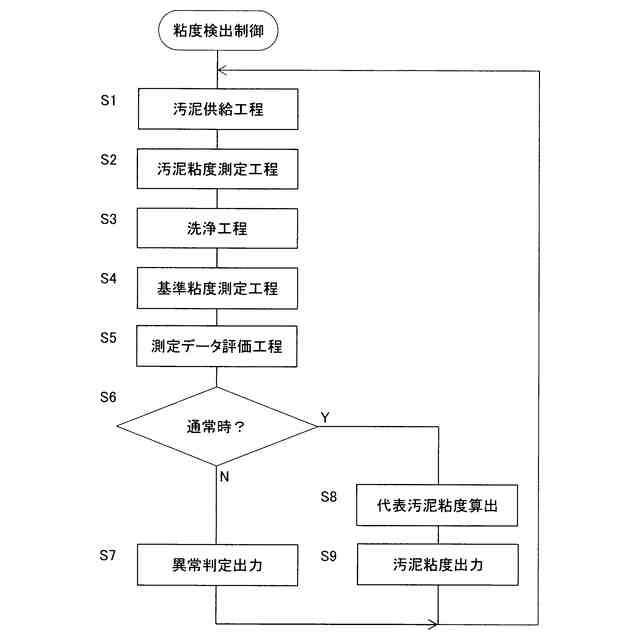 制御装置は、試料供給系からチャンバー内に試料とする汚泥を供給する汚泥供給工程と、チャンバー内に汚泥試料を貯留し、振動式粘度計によりチャンバー内に保持する汚泥試料の粘度を測定する粘度測定工程と、洗浄液供給系からチャンバー内に洗浄液を供給し、汚泥試料をチャンバーから試料排出系へ排出する洗浄工程と、洗浄液供給系から供給する洗浄液をチャンバー内に貯留する待機工程を、この順序で繰り返し実行する。