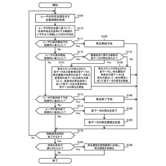 特許文献1に開示された情報提供システムでは、ユーザが、特定の案内範囲にて再生される詳細音情報を最後まで聞かないまま、別の場所に移動し、その後、同じ案内範囲に戻ってきたような場合に再生される音情報は、詳細音情報ではなく、簡易音情報に変更されることになる。そのため、ユーザが、詳細音情報が途中まで再生された時点で別の場所に移動し、元の場所に戻ってくると、簡易音情報が再生されるので、詳細音情報に含まれる詳細な内容を途中から聞くことができなかった。