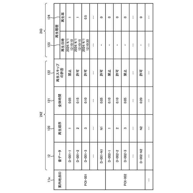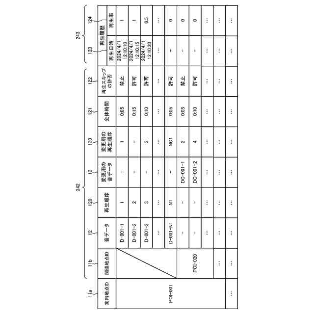 前記案内地点に関連付けられた他の前記案内地点を示す関連地点、前記関連地点に関する前記地点情報が提供されたときに前記案内地点に関する前記地点情報を変更するための1又は複数の変更用の音データ、及び、前記複数の音データ及び前記1又は複数の変更用の音データを再生するときの変更用の再生順序を前記案内地点毎にさらに記憶し、