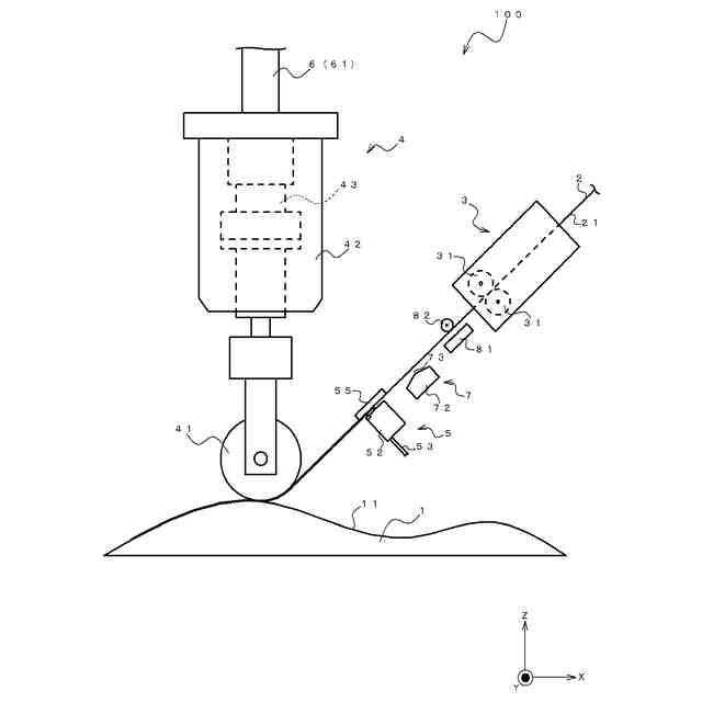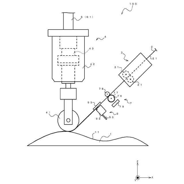 航空機や自動車などの産業分野で要求される高性能な繊維強化プラスチック部品を製造するために、テープ貼付装置によって樹脂が炭素繊維などの繊維束に含侵されたテープをワーク(プラスチック部品)の被貼付面に張り付けることで、ワークの重量が重くなることを防ぎつつ、強度を向上させている。