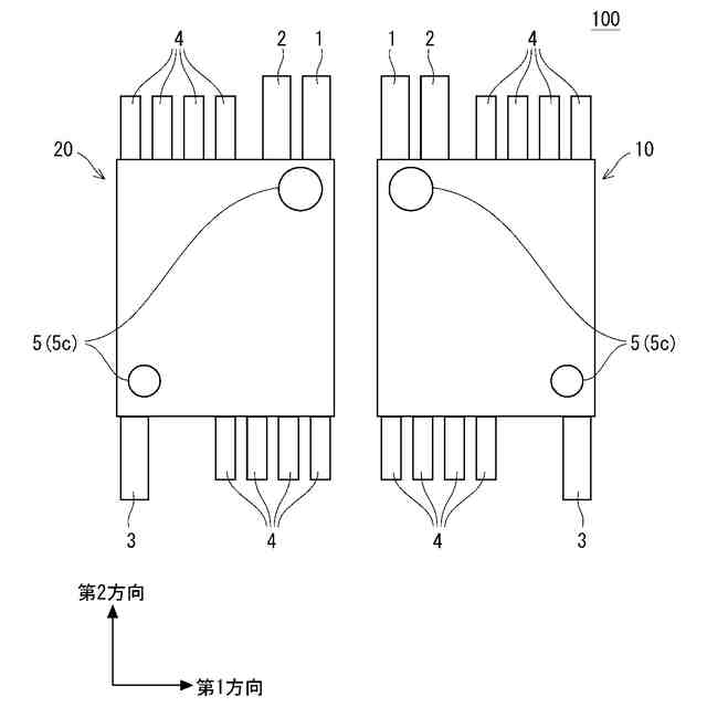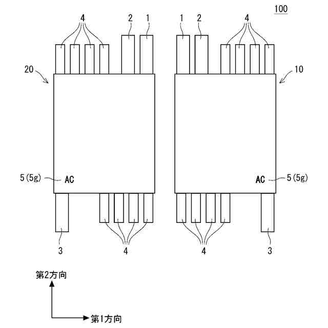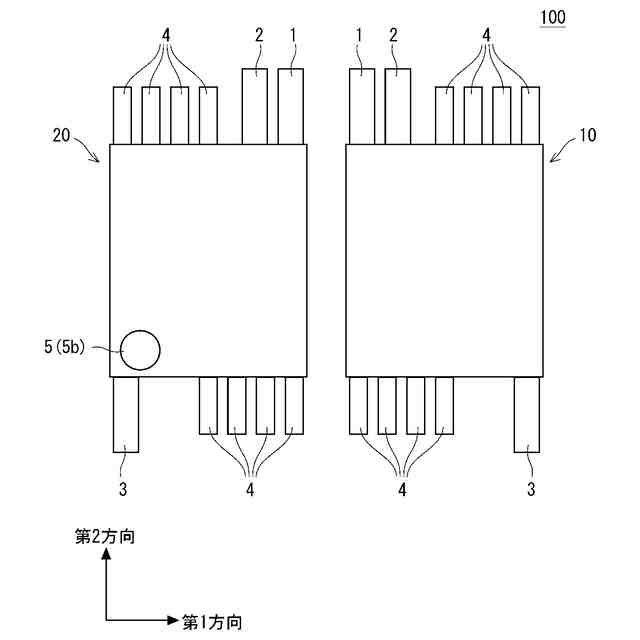 図1は、実施の形態1に係る半導体装置100の構成を示す上面図である。図1のように、半導体装置100は、第1方向に並べて配置された標準型半導体モジュール10とミラー型半導体モジュール20とが、基板(不図示)上に搭載された構造を有している。