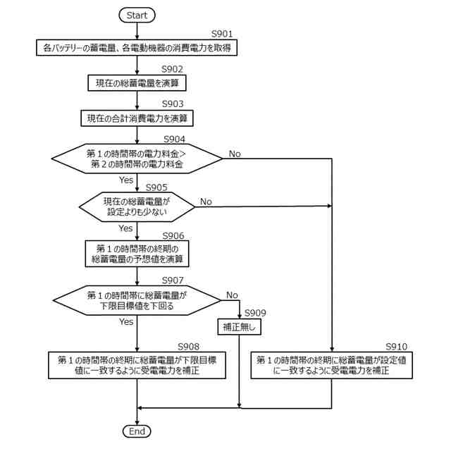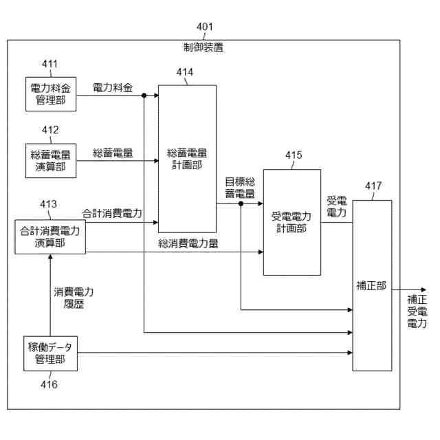 現在の総蓄電量と、設定した受電電力に基づく計画値との差分を減少させるように受電電力の設定を補正する