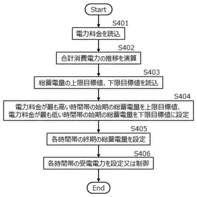 前記第1の時間帯の電力料金が前記第2の時間帯の電力料金よりも低く、前記第1の時間帯の終期まで最大限受電したときの前記第1の時間帯の終期における総蓄電量の予想値が前記上限目標値より大きい場合、前記第1の時間帯の終期の総蓄電量の目標値を前記上限目標値に設定し、