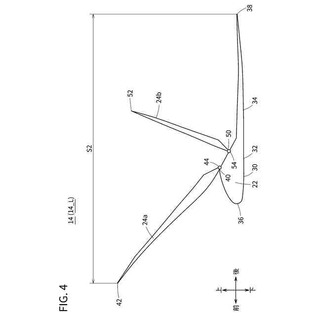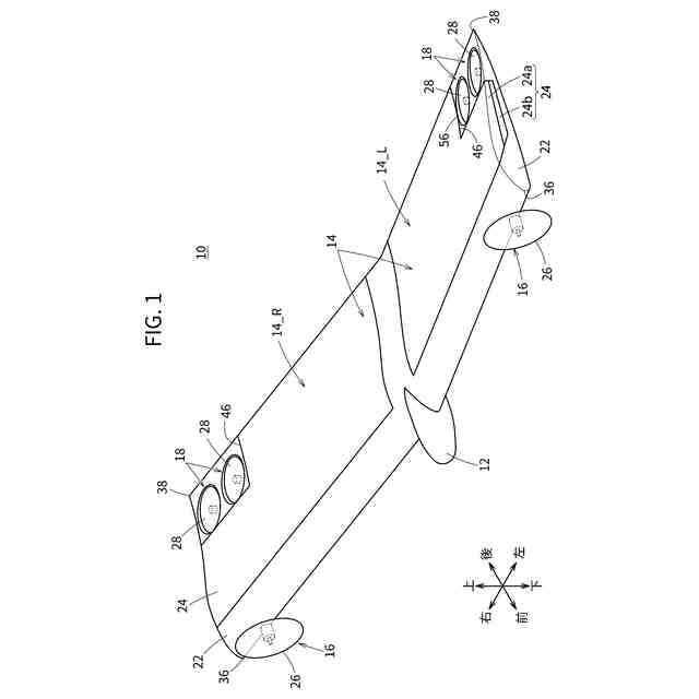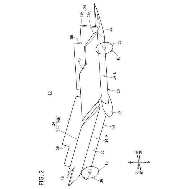 図1及び図2は、本実施形態に係る飛行体10の概略斜視図である。図1は、固定翼部22と展開翼部24とが重畳された状態の飛行体10を示す。図2は、展開翼部24が固定翼部22から展開された状態の飛行体10を示す。図1に示す斜視図と図2に示す斜視図とでは、飛行体10を見る角度が相違する。