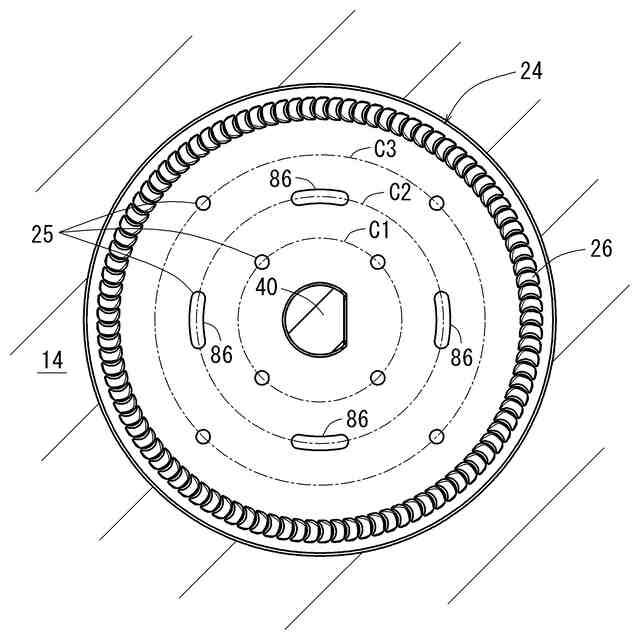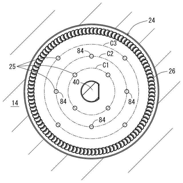 実施形態によっては、インペラの回転軸から見たときの第1の貫通孔と第2の貫通孔と第3の貫通孔の半径方向距離が同一である。これにより、インペラの貫通孔の位置によっては気体排出ラインが直線的となり、シャフト室からの気体排出性が向上する。