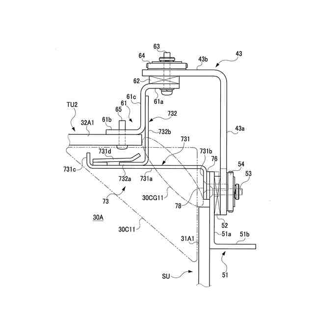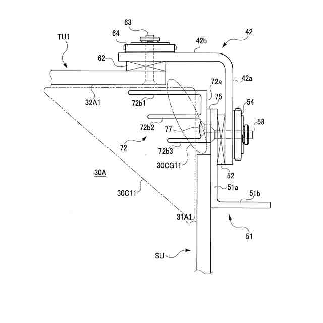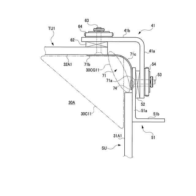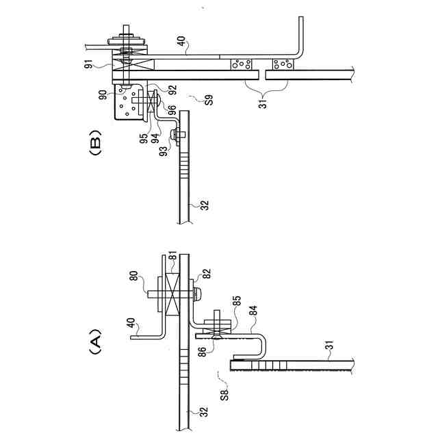 従来設置方法1によると、図7(A)に示すように、天井パネル32は、車体幅方向の外側端部でボルト80によって、屋根構体に支持されている天井骨40にスペーサー81を介して固定されている。また、天井パネル32とボルト80の頭部との間には、断面L字形状の連結部材82が一方の直線部分で締結されている。連結部材82の一方の直線部分の車体幅方向の内側端部から他方の直線部分が車体高さ方向下側に向けて屈曲している。また、仕切パネル31は、上端部の車体幅方向の車外側の背面で受部材84に接合されている。そして、連結部材82の他方の直線部分には、ライナープレート85を介して受部材84がボルト86によって締結されている。その結果、仕切パネル31は、天井パネル32の車体幅方向の車外側先端よりも車内側に入り込んだ位置に配置され、天井パネル32から下方に所定距離をおいて設置されている。すなわち、天井パネル32と仕切パネル31の上端との間には隙間S8が形成されている。しかしながら、ボルト80と隙間S8との間は、連結部材82および受部材84によって遮断されている。したがって、仮に天井パネル32を取り外したい場合は、まずは隙間S8からボルト86を抜くことで仕切パネル31を取り外し、それからボルト80を抜いて天井パネル32を取り外す必要がある。