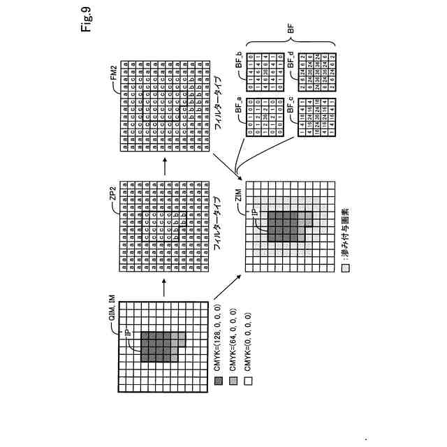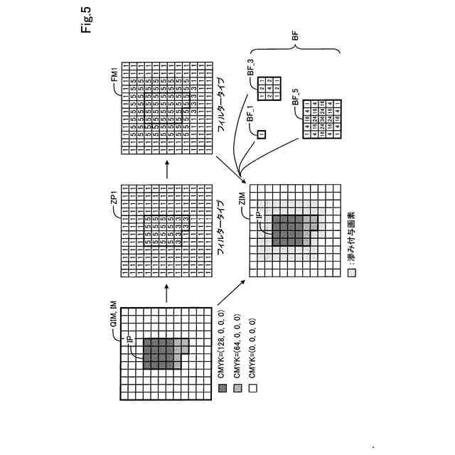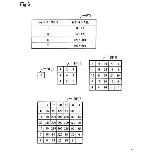 (c1)個々の画素の前記インク量に応じて選択された前記フィルタータイプのぼかしフィルターの中心を前記個々の画素に仮配置し、仮配置された前記ぼかしフィルターのフィルター領域に含まれる全画素に対して前記ぼかしフィルターを適用することを仮決定することによって、前記個々の画素に対して1つ以上の前記ぼかしフィルターを適用することを仮決定する工程と、
