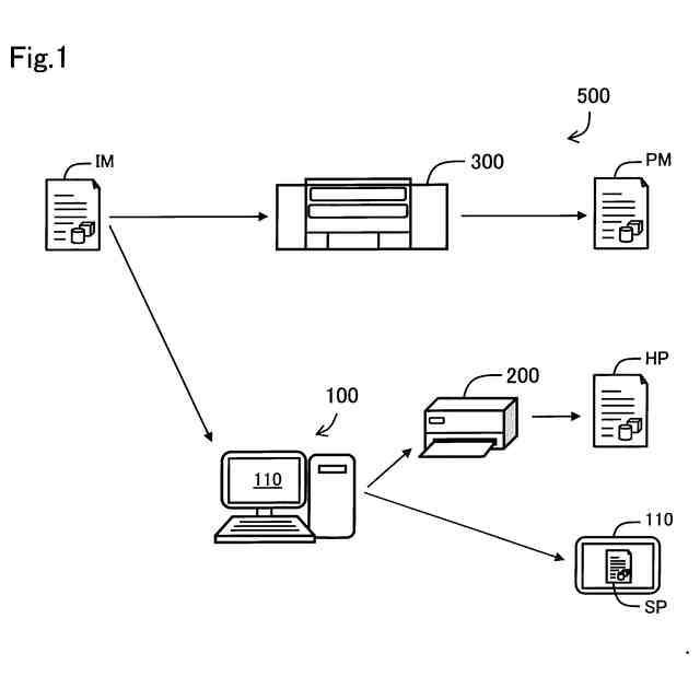 図1は、印刷物の校正を行う印刷システム500を示す説明図である。この印刷システム500は、入力画像データIMに従って印刷物PMの印刷を行う印刷機300と、入力画像データIMを用いてプルーフ画像データを作成するプルーフ画像データ作成装置100と、校正用印刷装置200とを備える。校正には、校正用印刷装置200を用いて校正刷りHPを印刷するハードプルーフと、プルーフ画像データに従って表示装置110にプルーフ画像SPを表示するソフトプルーフとがある。ハードプルーフでは、校正用印刷装置200が「プルーフ出力装置」に相当し、ソフトプルーフでは表示装置110が「プルーフ出力装置」に相当する。プルーフ出力装置から出力される画像を、「出力画像」とも呼ぶ。ハードプルーフでは校正刷りHPが「出力画像」に相当し、ソフトプルーフではプルーフ画像SPが「出力画像」に相当する。