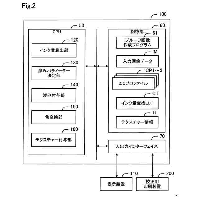プルーフ画像データ作成装置100は、ハードプルーフとソフトプルーフのうちの少なくとも一方を実行可能に構成される。ハードプルーフでは、プルーフ画像データ作成装置100で作成されたプルーフ画像データに従って校正用印刷装置200が校正刷りHPを印刷する。校正用印刷装置200がインクジェットプリンターである場合には、プルーフ画像データ作成装置100は、プルーフ画像データに色変換処理やハーフトーン処理を適用して印刷用のドットデータを作成し、このドットデータを校正用印刷装置200に供給して校正刷りHPの印刷を実行させる。ソフトプルーフでは、プルーフ画像データ作成装置100で作成されたプルーフ画像データに従って表示装置110にプルーフ画像SPが表示される。本開示は、ハードプルーフとソフトプルーフのいずれにも適用可能である。