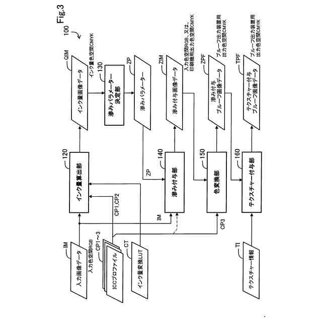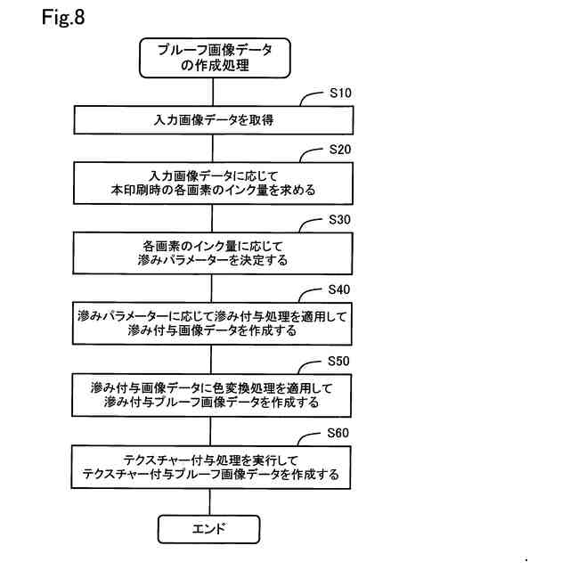 本開示の第3の形態によれば、プルーフ画像データを作成するコンピュータープログラムが提供される。このコンピュータープログラムは、(a)入力画像データに応じて印刷機を用いて印刷媒体上に印刷物を印刷する際の各画素のインク量を表すインク量画像データを求める処理と、(b)前記各画素の前記インク量に応じて前記各画素の滲みパラメーターを決定する処理と、(c)前記入力画像データの色空間を前記印刷機用の出力色空間に変換した本印刷用画像データと、前記入力画像データと、のいずれかに対して前記滲みパラメーターに応じて滲み付与処理を適用することによって、滲み付与画像データを作成する処理と、(d)前記滲み付与画像データの色空間をプルーフ出力装置用の出力色空間に変換する処理を実行することによって、滲み付与プルーフ画像データを作成する処理と、をコンピューターに実行させる。