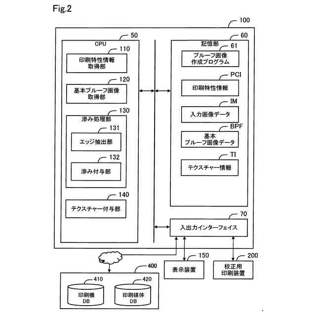 図1は、印刷物の校正を行う印刷システム500を示す説明図である。この印刷システム500は、入力画像データIMに従って印刷物PMの印刷を行う印刷機300と、入力画像データIMを用いてプルーフ画像データを作成するプルーフ画像データ作成装置100と、校正用印刷装置200と、クラウドサーバー400とを備える。校正には、校正用印刷装置200を用いて校正刷りHPを印刷するハードプルーフと、プルーフ画像データに従って表示装置150にプルーフ画像SPを表示するソフトプルーフとがある。ハードプルーフでは、校正用印刷装置200が「プルーフ出力装置」に相当し、ソフトプルーフでは表示装置150が「プルーフ出力装置」に相当する。プルーフ出力装置から出力される画像を、「出力画像」とも呼ぶ。ハードプルーフでは校正刷りHPが「出力画像」に相当し、ソフトプルーフではプルーフ画像SPが「出力画像」に相当する。