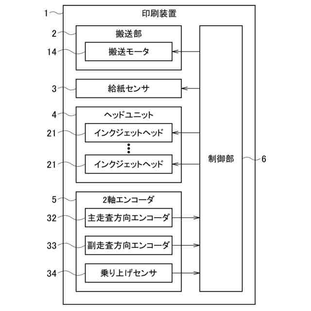 【解決手段】インクジェットヘッド21は、搬送ベルト11により搬送される印刷媒体Pの搬送方向に直交する主走査方向に配列された複数のノズルを有し、搬送される印刷媒体Pに複数のノズルからインクを吐出して画像を印刷する。2軸エンコーダ5は、搬送ベルト11により搬送される印刷媒体Pの主走査方向における位置の変動を検出する。制御部6は、2軸エンコーダ5により検出された印刷媒体Pの主走査方向における位置の変動に応じて、インクジェットヘッド21により印刷する画像の各画素と各画素に対してインクを吐出するノズルとの対応関係を制御する。