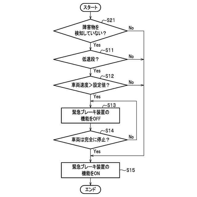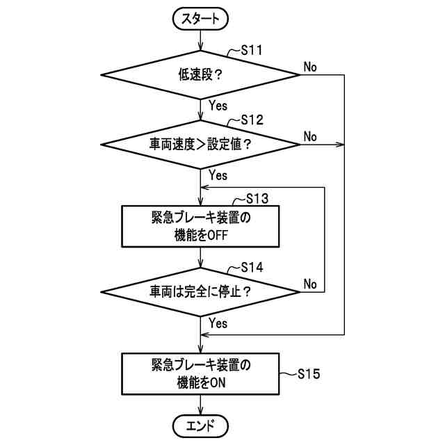 前記車両速度が設定値以下の場合、前記緊急ブレーキ装置の機能をONとし、