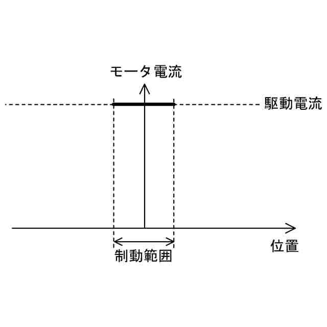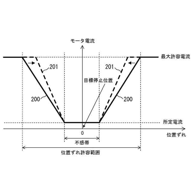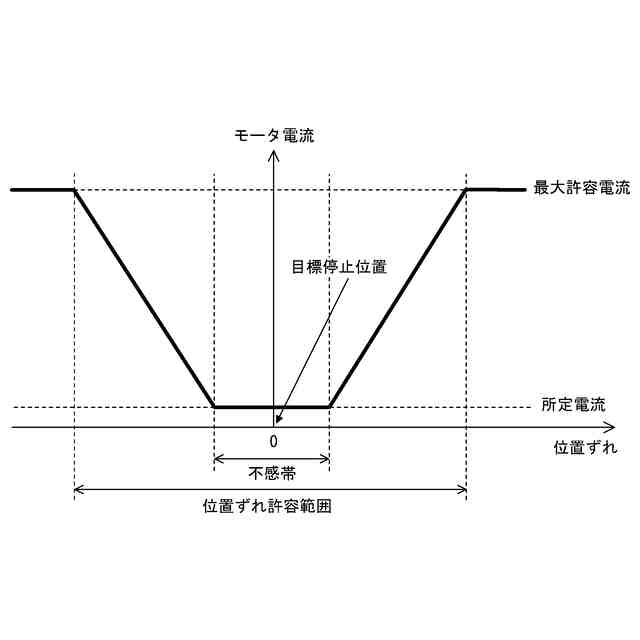 一方、特許文献2には、モータのロータを目標停止位置まで回転させる制御を行った後、目標停止位置からずれていない場合は電流を流さず、目標停止位置からずれた場合はずれをもたらした負荷に応じた電流を流してロータの位置を保持する制御装置が開示されている(図8)。図8の例では、目標停止位置を中心とする所定の範囲内ではモータに電流が流れない。