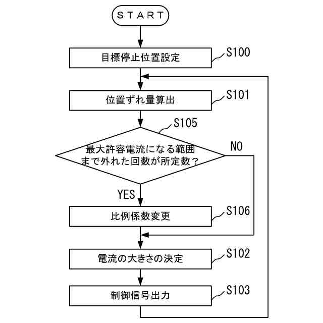 また、本発明のモータの駆動制御方法の1構成例において、前記第2のステップは、前記位置ずれ量が前記不感帯内に最初に入った後に、前記モータに流す電流が前記最大許容電流になる範囲まで前記位置ずれ量が外れた回数をカウントし、カウントした回数が所定数に達したときに、前記比例係数を所定の変更幅だけ大きくするステップを含むことを特徴とするものである。