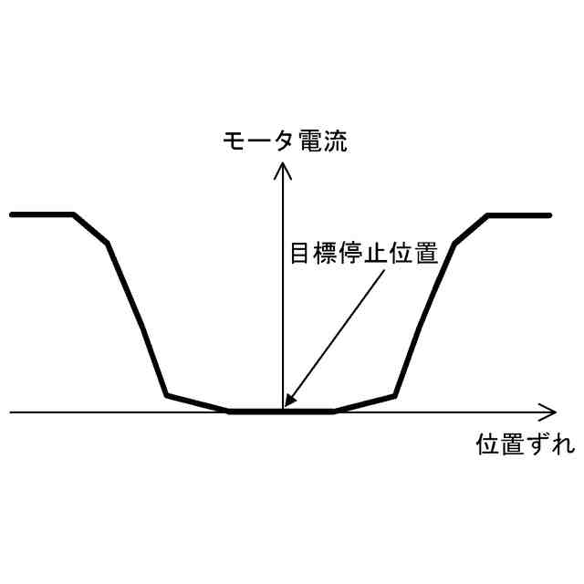 また、本発明のモータの駆動制御方法の1構成例において、前記第2のステップは、前記位置ずれ量が前記不感帯から外れた場合には、前記位置ずれ量と前記所定値と前記不感帯と比例係数とによって決まる1次式によって、前記モータに流す電流の大きさを算出し、算出した電流の大きさが前記最大許容電流以上となった時点で、前記モータに流す電流の大きさを前記最大許容電流と等しくなるように制限するステップを含むことを特徴とするものである。