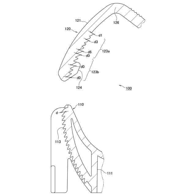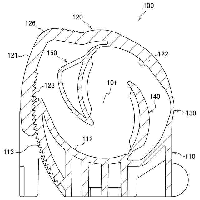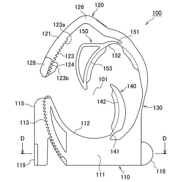 前記第2係止歯列は、前記第2保持片の基端側に位置する1または複数の基端側係止歯と、前記第2保持片の先端側に位置する1または複数の先端側係止歯とから構成され、前記第1係止歯列の一の係止歯と前記基端側係止歯とが係合したときの係合深さが、前記第1係止歯列の前記一の係止歯と前記先端側係止歯とが係合したときの係合深さよりも小さいことを特徴とする。