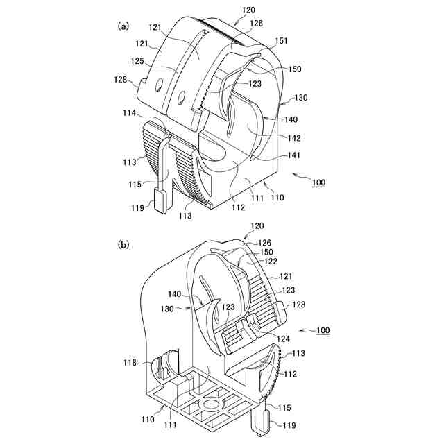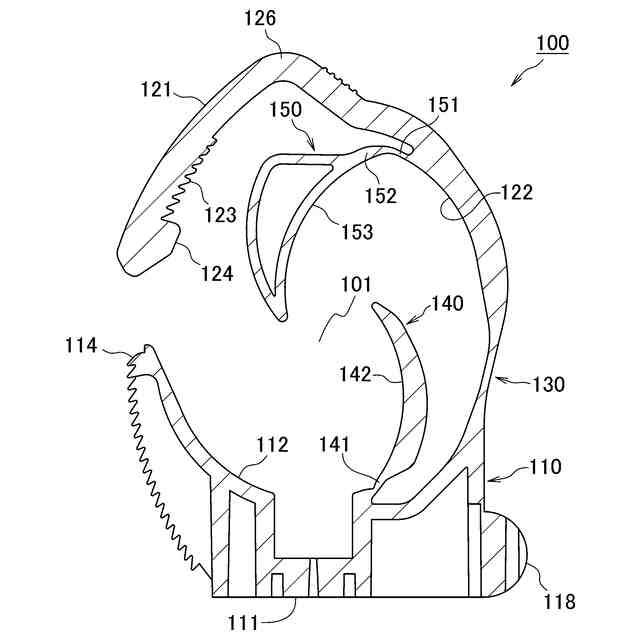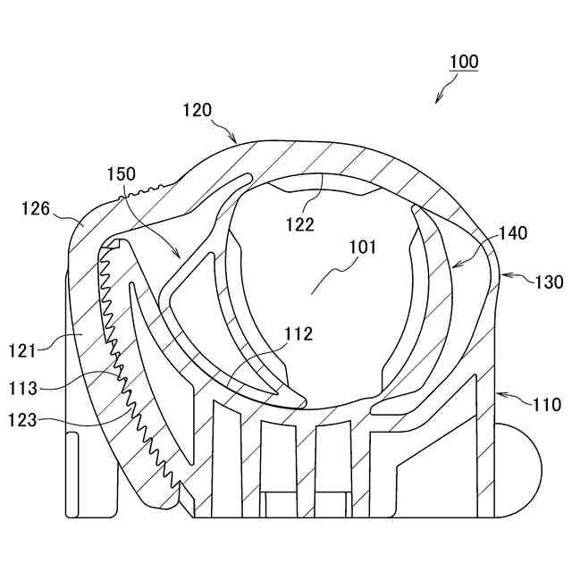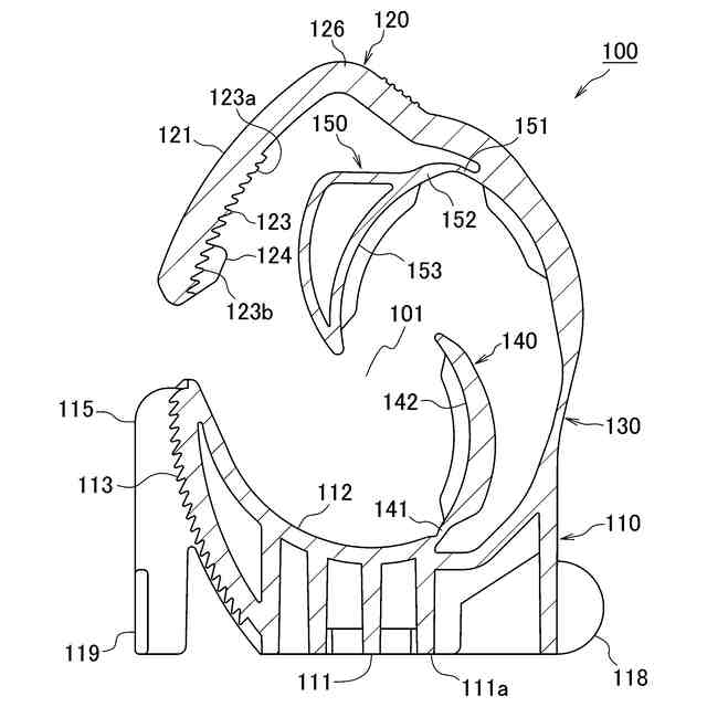 特許文献1の配線・配管材保持具は、保持する配線・配管材の外周面に対して隙間を介して対向するように配線・配管材の配設方向に張り出した解除操作部を設けたことにより、配線・配管材に干渉されることなく係止解除操作を行うことを容易とするものである。しかしながら、従来(特許文献1)の配線・配管材保持具では、第1および第2係止歯列の係止状態を解除操作する際、外側の第2保持片の先端部位を第1保持片の先端部位から離間させるように径方向外側に変形させるとき、相対的に小さい操作量で第2係止歯列の先端寄りの係止歯を第1係止歯列の係止歯から離間させることが可能である一方で、基端寄りの係止歯を第1係止歯列の係止歯から離間させるには、相対的に大きい操作量が必要となる。そのため、ユーザーは、第2係止歯列の先端側の係止歯を係止解除した後、第2保持片をより一層大きく外側に離間変形させることが求められ、操作性が低下することが問題であった。すなわち、従来の配線・配管材保持具において、係止解除における操作性を改善することが課題として挙げられる。