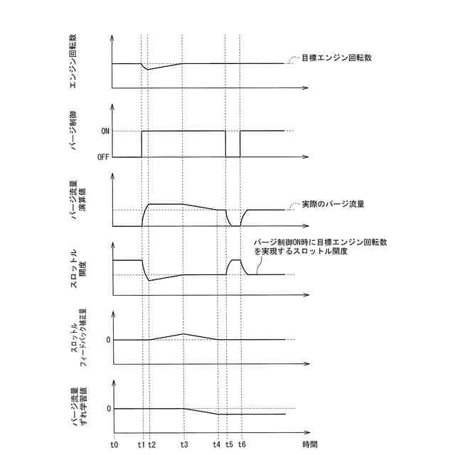 ところで、キャニスタから吸気系にパージガス(蒸発燃料)が導入されると吸気量が変動する。そこで、パージガスの導入時は、推定により求めたパージガスの流量を勘案してスロットルバルブの開度が調整される。したがって、吸気系に導入されるパージガスの流量を正確に推定しておくことが必要であるが、パージシステムにおける部品の個体差や経年劣化によって、パージガスの流量の推定値と実際の流量との間にずれ(パージ流量ずれ)が生じる可能性がある。このパージ流量ずれにより吸気量が変動すると、アイドリング時やクルーズコントロール制御時のエンジン回転数が目標エンジン回転数から乖離してしまい、ドライバに違和感を与える可能性がある。
