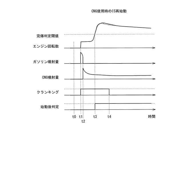 したがって、特許文献1に記載のバイフューエル車両は、燃料インジェクタの配置(燃焼室までの距離)および燃料特性(発火点)に起因して、アイドリングストップからのCNGを使用した内燃機関の再始動時に、クランキングの開始から自立回転の開始までに長時間を要し、内燃機関の始動性が劣るため、ドライバの意図するタイミングで発進することができない可能性がある。